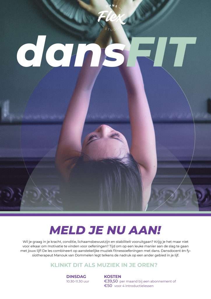 Onze collega Manouk van Dommelen geeft DansFIT lessen bij Flex Dansstudio in Nijmegen! Wekelijks op dinsdagochtend van 10:30u – 11:30u wordt in deze les op een rustige manier gewerkt aan bovenstaande elementen. Fitnessoefeningen worden hierbij gecombineerd met dans en zullen op muziek worden uitgevoerd. Voor deze les is danservaring niet nodig.